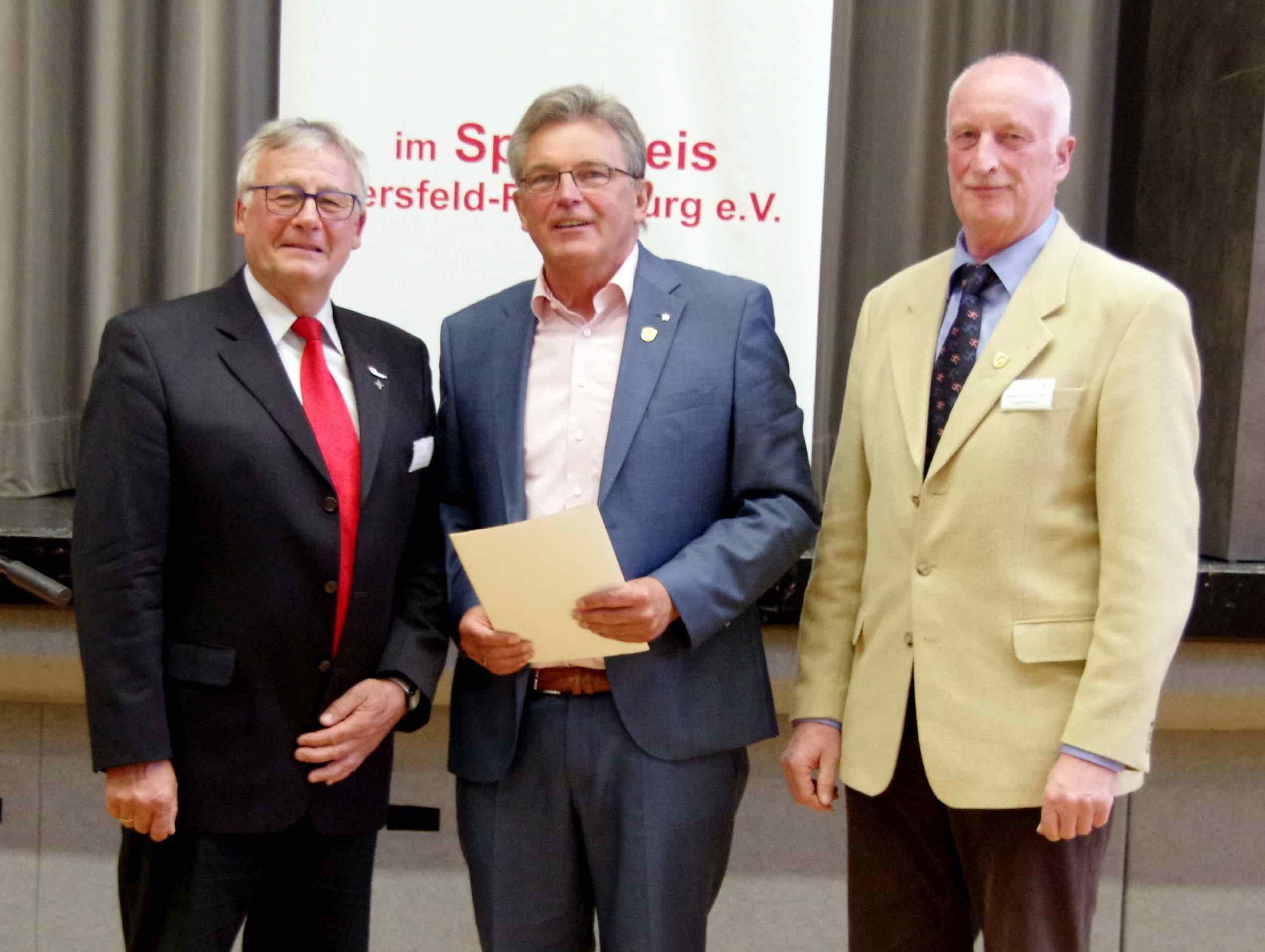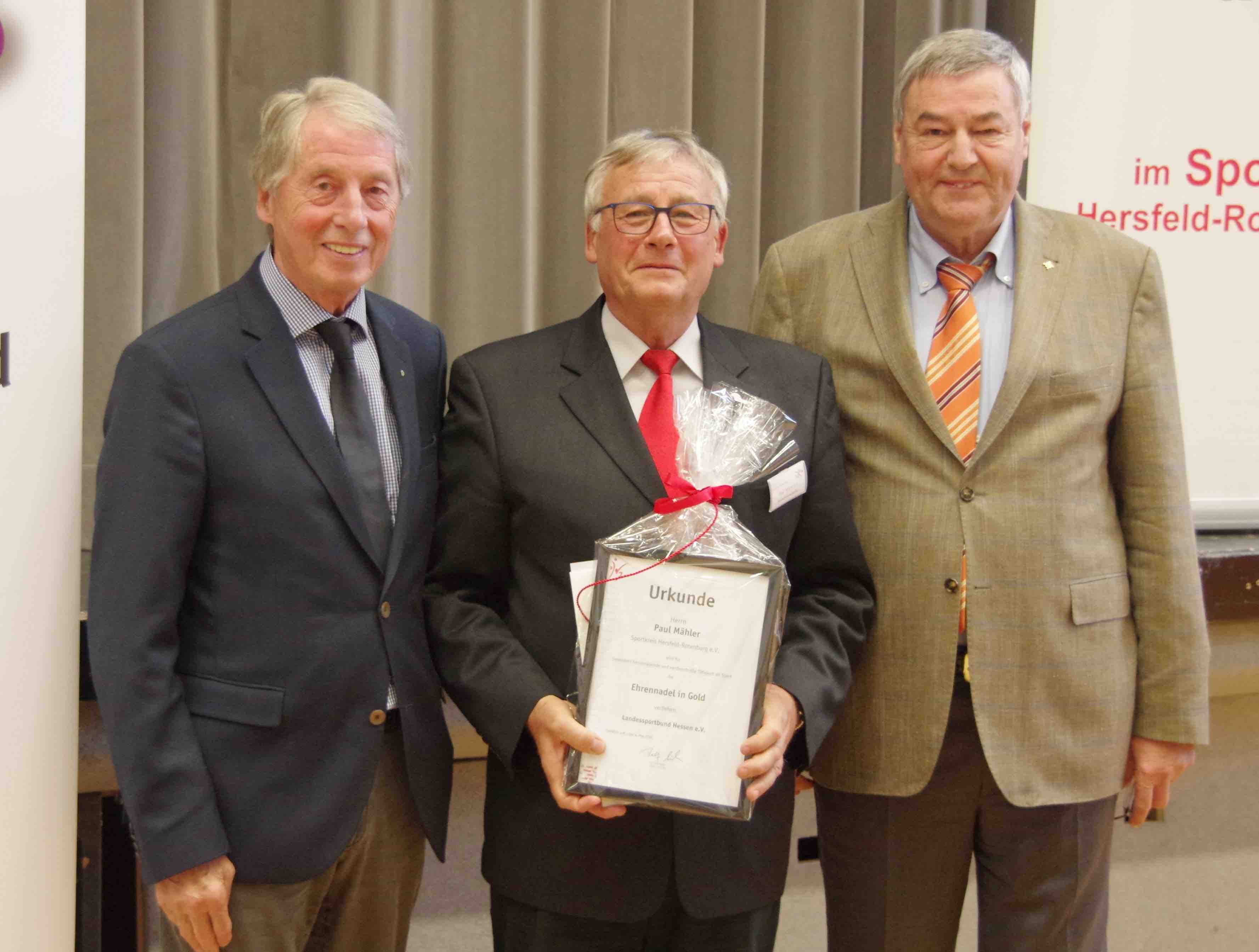 Mit der Ehrennadel in Gold des Landessportbundes Hessen wurde Paul Mähler (Mitte) beim Sportkreistag durch Präsident Dr. Rolf Müller (rechts) und Vizepräsident Rolf Hocke (rechts) beim Sportkreistag in Rotenburg ausgezeichnet.