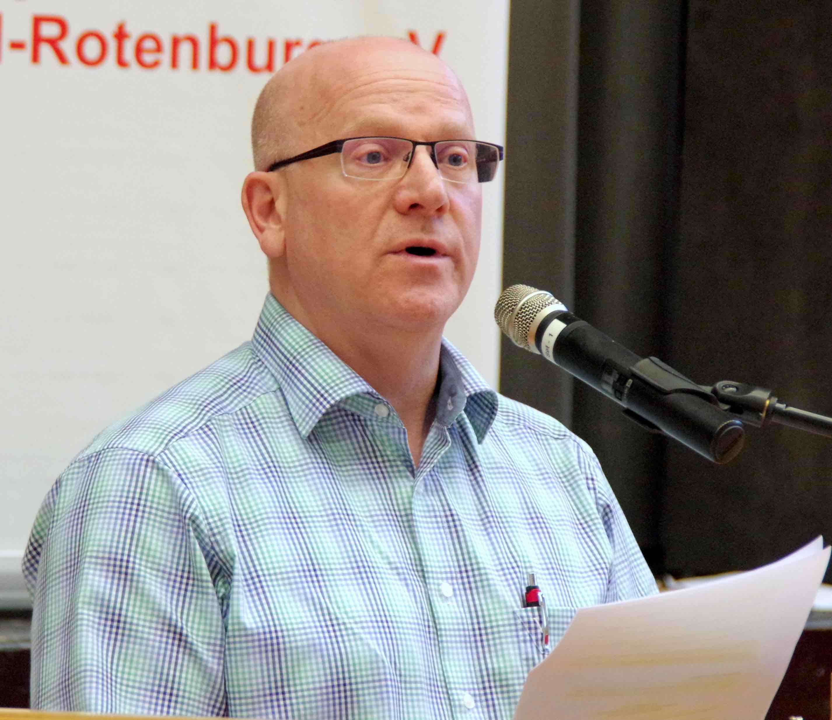 Christian Grunwald stellt sich den Delegierten beim Sportkreistag in Rotenburg vor. Im Hintergrund die Wahlkommission mit Dr. Rolf Müller, Ulrich Manthey und Siegfried Finkhäuser.