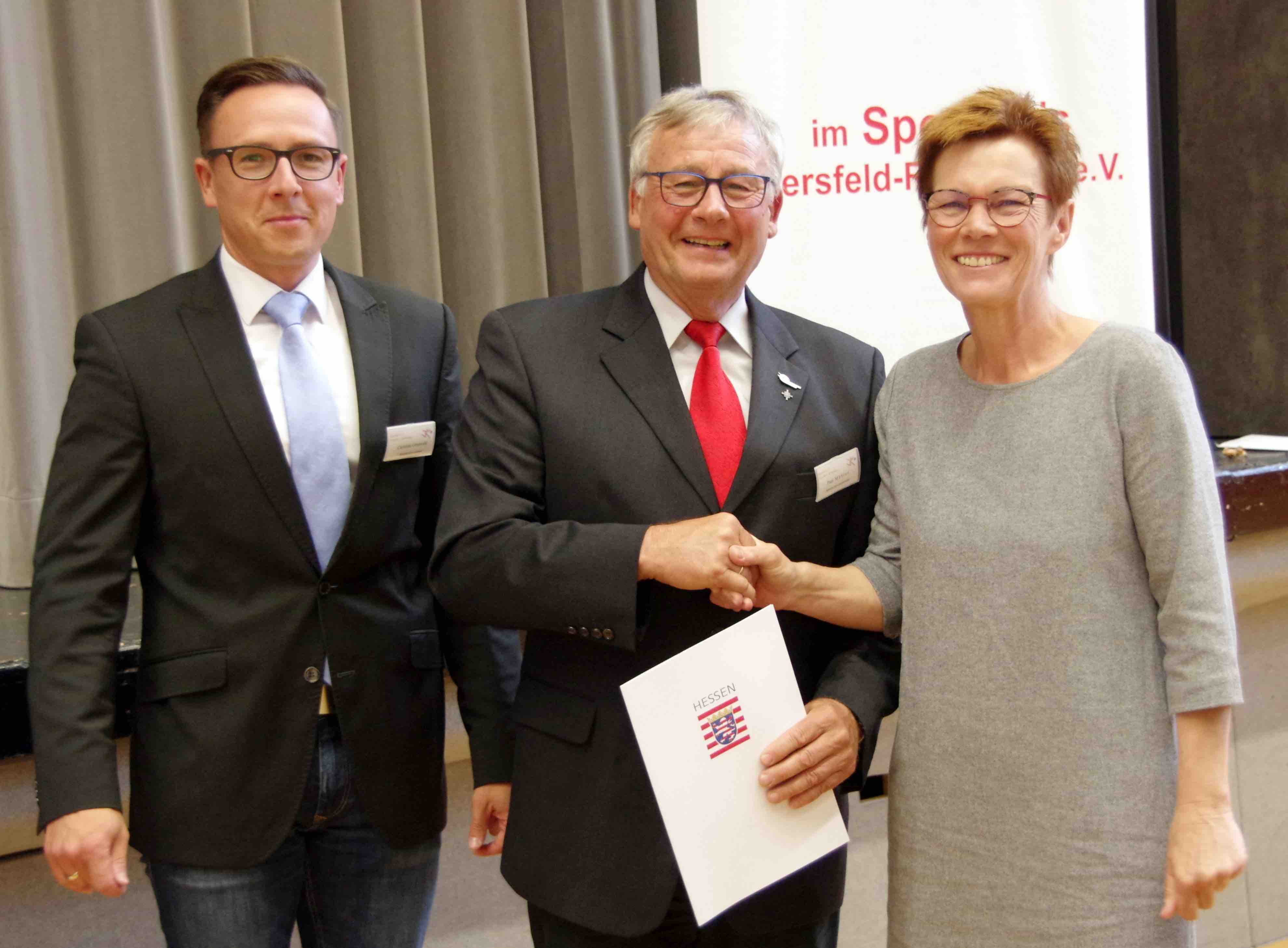 Hohe Auszeichnung: Mit dem Ehrenbrief des Landes Hessen zeichnete die Erste Kreisbeigeordnete Elke Künholz (rechts) den langjährigen Sportkreisvorsitzenden Paul Mähler (Mitte) beim Sportkreistag in Rotenburg aus. Erster Gratulant des Geehrten war sein Nachfolger im Amt des Sportkreisvorsitzenden, Rotenburgs Bürgermeister Christian Grunwald (links).