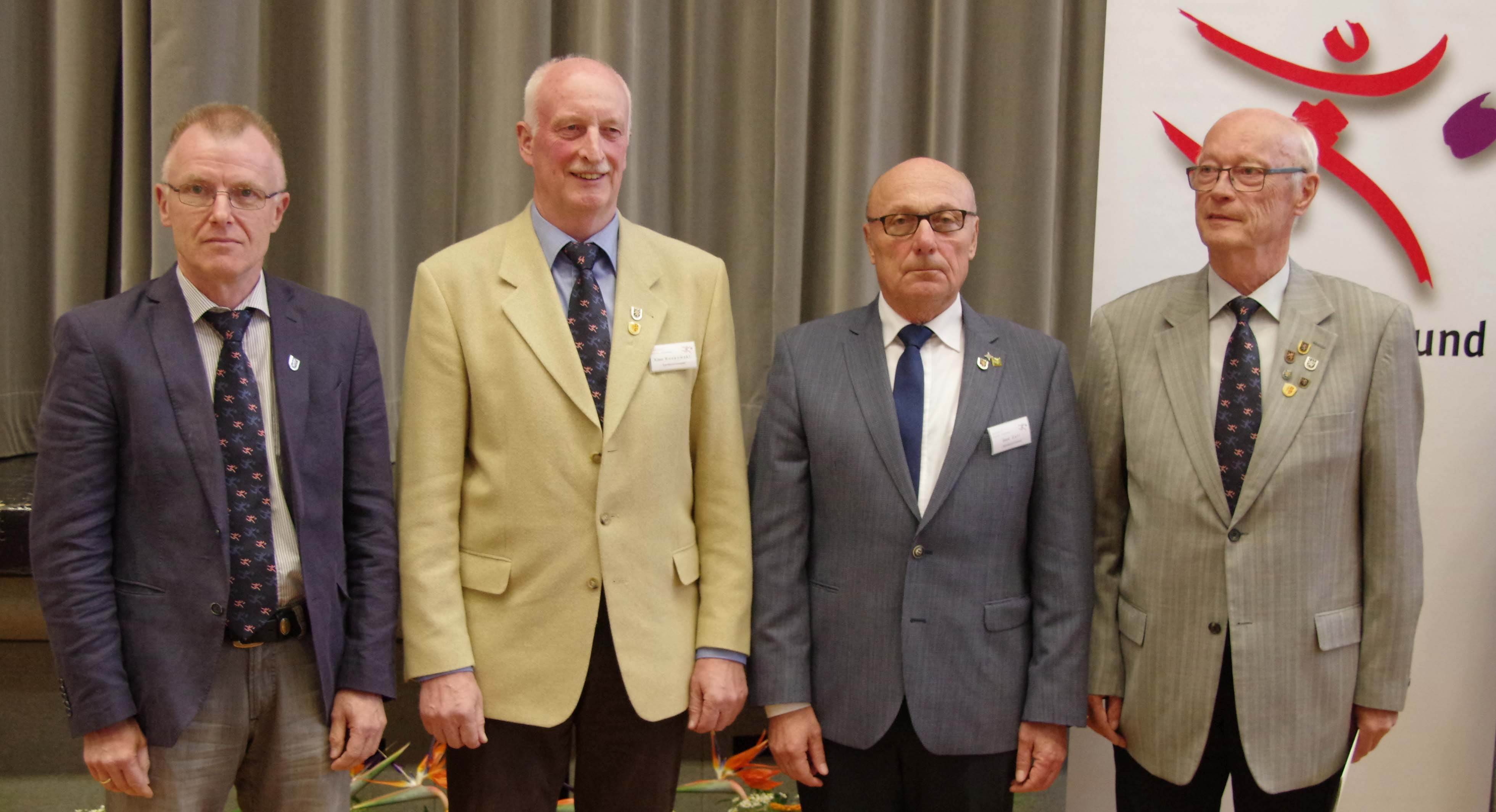 Klaus-Dieter Ratz (links) ist als Schriftführer nach über 30 Jahren der ehrenamtlichen Mitarbeit aus dem Vorstand des Sportkreises Hersfeld-Rotenburg ausgeschieden. Beim Sportkreistag 2018 in Rotenburg wurde er zusammen mit Klaus Ronkowski (ab 2. von links), Horst Holl und den inzwischen verstorbenen Karl-Heinz Aschenbrenner vom Landessportbund Hessen mit der Ehrennadel in Silber geehrt.